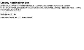 Kakaofreie Scokoladenalternative - (Zucker, pflanzliches Fett, ChoViva Konzent Sonnenblumenmehl, Emulgator: Sonnenblumenlecihin, natürliches Aroma.), Haselnuss Paste - (100% Haselnüsse), Kakaobutter