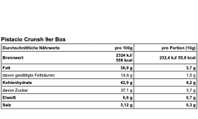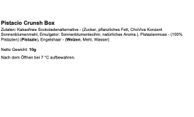 Kakaofreie Scokoladenalternative - (Zucker, pflanzliches Fett, ChoViva Konzent Sonnenblumenmehl, Emulgator: Sonnenblumenlecihin, natürliches Aroma.), Pistazienmuss - (100% Pistazien) (Pistazie), Engelshaar - (Weizen, Mehl, Wasser)